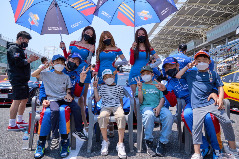 [CJ대한통운] KIC 그리드워크 이벤트에 참여해 선수들과 레이싱 모델과 사진을 찍고 있는 모습