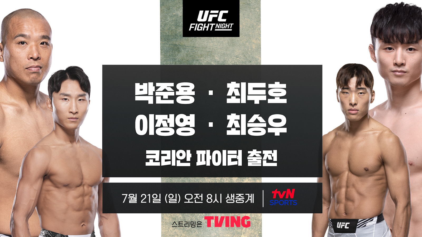 [CJ ENM 엔터] ‘UFC 파이트 나이트’에 코리안 파이터 4인 출격! 21일(일) 오전 8시 tvN SPORTS와 TVING(티빙)에서 생중계!